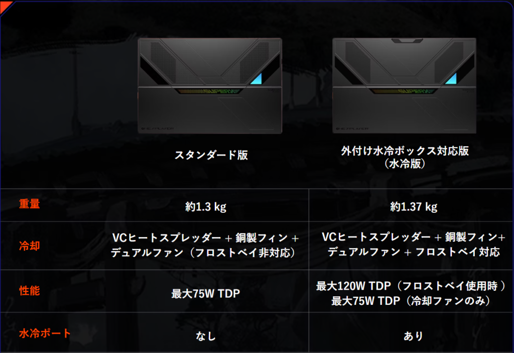 スタンダード版は最大75w、水冷対応版が最大120wだそうです。