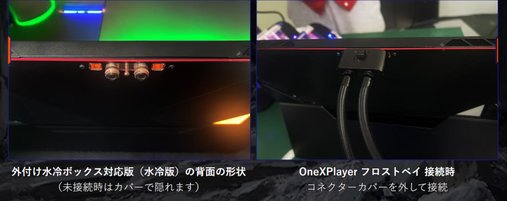 | ・フロストベイと接続することでTDPを120wまで使用が可能 ・フロストベイはONEXFLY APEXにも使える(今後も水冷対応製品を発売予定) ・交換用の液は精製水または純水のみ使える(メンテナンス性を重視した) (クーラントは使えないとのこと) ・電源を落としてからでなければフロストベイは外せない ・背面キャップはメタル製 ・フロストベイは予想よりも大きい ・ケーブルを4本(水冷2本、ACケーブル、onex本体への電源供給ケーブル)繋ぐ必要がある ・水冷ケーブルが短いので据え置き作業が主になるだろう ・持ち運ぶ際には必ず水を抜く必要もある ・水冷式PCは寒いと起動しにくいが、フロストベイは寒くても問題ない。 (外で使う事が無ければ大丈夫) |